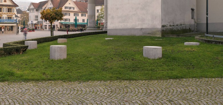 Denkanstöße des Künstlers Hubert Matt, Bregenz, zum Denk-Ort vor dem Kirchturm St. Martin