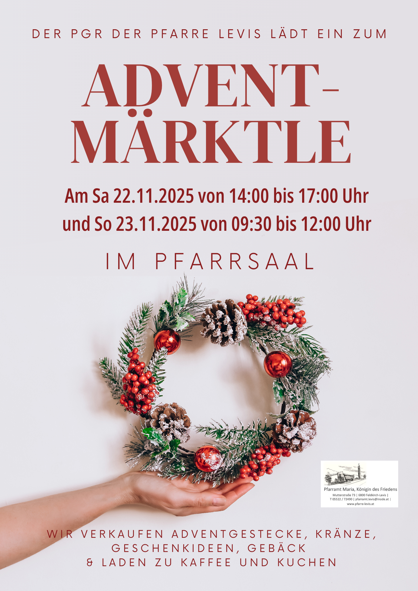 Sollen wir Sie per Mail informieren, wann wir im nächsten Jahr wieder mit dem Kranzen und Basteln beginnen? Falls Sie Interesse hätten mitzuhelfen, können Sie sich ganz unverbindlich mit Ihrer E-Mail-Adresse hier eintragen, dann melden wir uns im nächsten Jahr bei Ihnen. In der Regel binden wir die Kränze am Donnerstag und Freitag vor Christkönig.