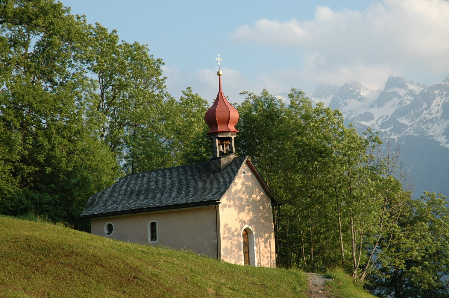 Das Lazer Kirchlein mit seinem steilen, leicht geschwungenen Dach und mit dem helmbewehrten Dachreiter über der Eingangsfassade ladet mit zwei Glöcklein im hellen Ton zum Gottesdienst ein.